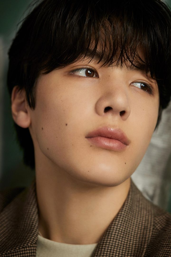 奥二重の目と丸みの帯びた鼻先がナチュラルで好感度抜群。ほんのり束感を出してシースルー風に前髪をセットし、少年らしさ満点な等身大の魅力をアピール。