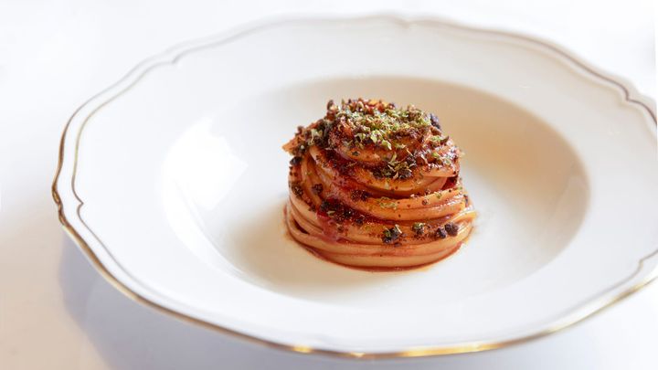 和牛を主役にした「和牛ラグーのリングイネ」は、アロイシオ シェフの幼少期の記憶に根ざしたストーリーを、ロミート シェフの技法で再構築した一皿。ナポリの郷土料理「カルネ・アッラ・ピッツァイオーラ」を着想源に、親しみのある味わいを現代的に洗練されたかたちへと昇華している。「ピッツァイオーラ」とはピッツァ職人風という意味で、トマトやにんにくなどのソースで肉や魚介を煮込んだ家庭料理だ。