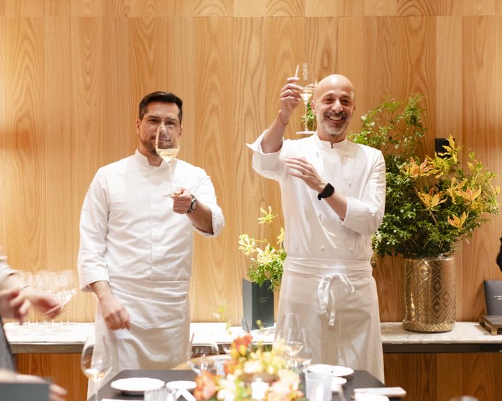 ロミート シェフ(写真右)の哲学を「東京シグネチャー ディッシュ」に落とし込んだのが、東京の「イル・リストランテ ニコ・ロミート」のレジデント ヘッド シェフ マウロ・アロイシオ(写真左)だ。ラグジュアリーホテルのレストランやミシュラン星付き店で経験を積んだ後、上海の「イル・リストランテ ニコ・ロミート」を率いてミシュラン一つ星を獲得。現代イタリア料理の根底にあるコンセプトやビジョンへの理解を深めてきた人物だ。