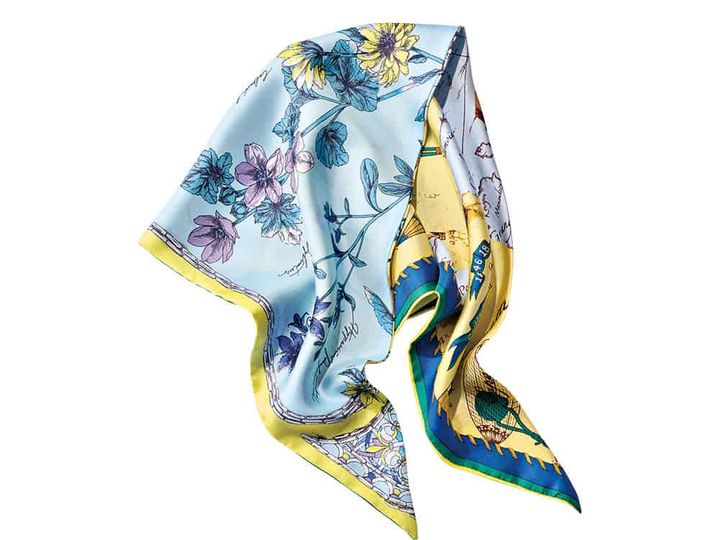 肌色を美しく、表情を明るく見せるスカーフを小さく首元に。