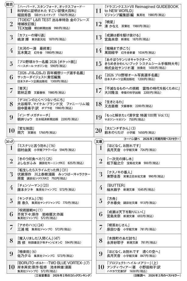 コミックは『ミステリと言う勿れ』(16)が1位だが、1月発売の『キングダム』(78)と『呪術廻戦≡』(1)も5位6位で前月に続いてリストに入っている。