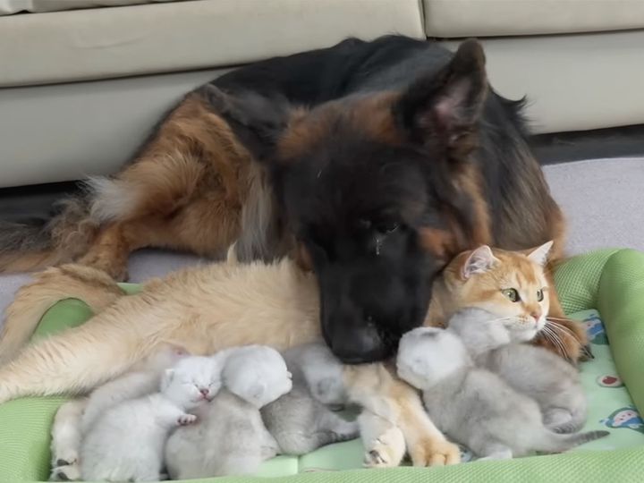 大型犬が子猫を寝かしつけ!? 母猫も信頼するほどの子守り上手