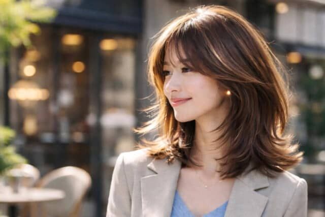 今っぽさを出すなら、顔まわりの動きが鍵に。頬やフェイスラインに沿ってレイヤーを入れることで、自然と視線が上に引き上がり、軽やかな印象に仕上がります。