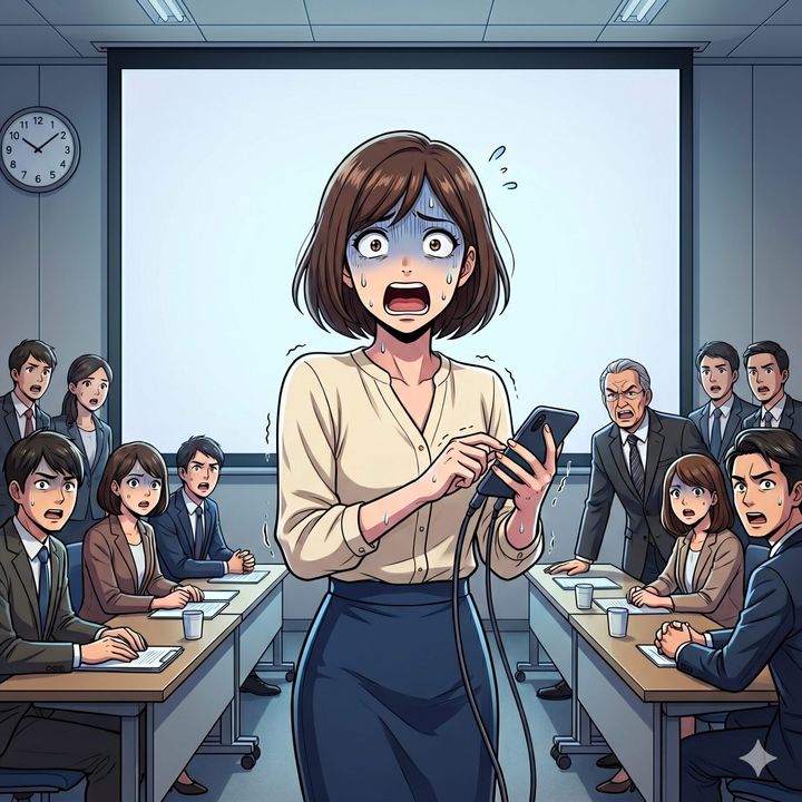 彼女が参考資料を共有するため、自身のスマートフォンをプロジェクターに接続した時のことです。スクリーンに大写しになったのは、予定していた資料ではなく、まさに彼女がリアルタイムで書き込んでいた裏アカウントの投稿画面でした。