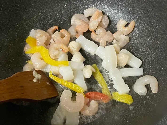フライパンで、シーフードミックス、パプリカをオリーブオイルとニンニクで炒めて味つけします。