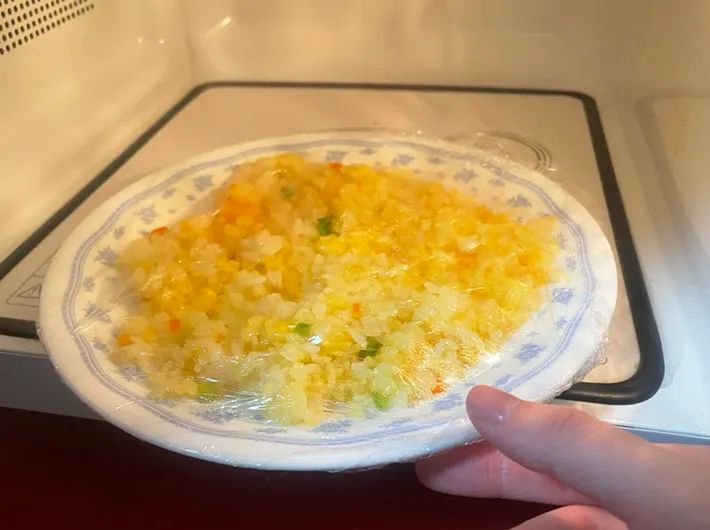 冷凍ピラフを耐熱容器に移して、電子レンジで加熱します。