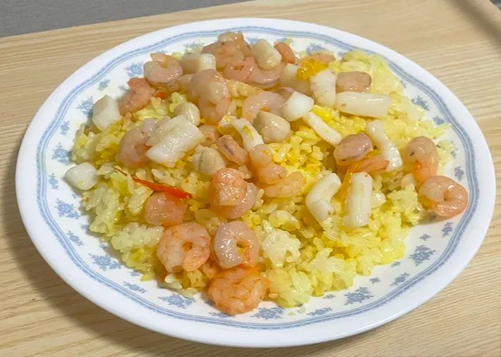 加熱した冷凍ピラフに、味つけをしたシーフードミックスやパプリカを盛りつけたら完成です。