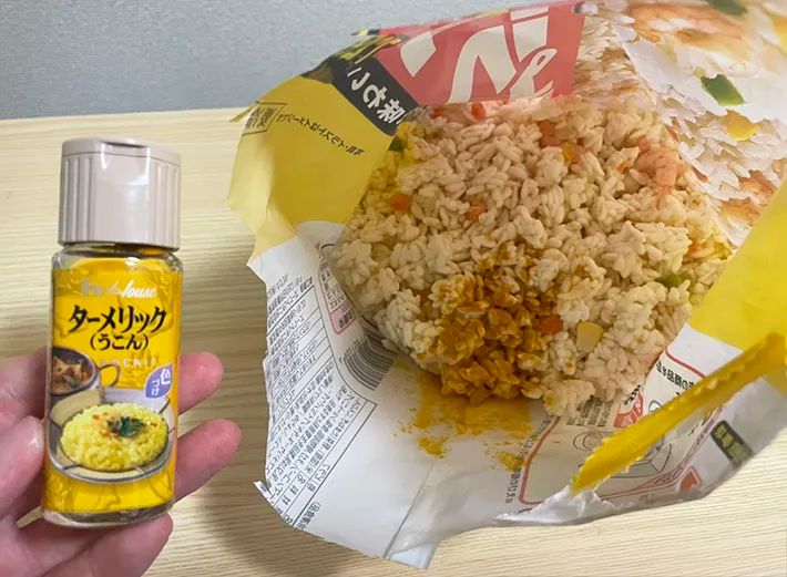 冷凍ピラフの袋の中に粉末のターメリックを入れて、振り混ぜてください。