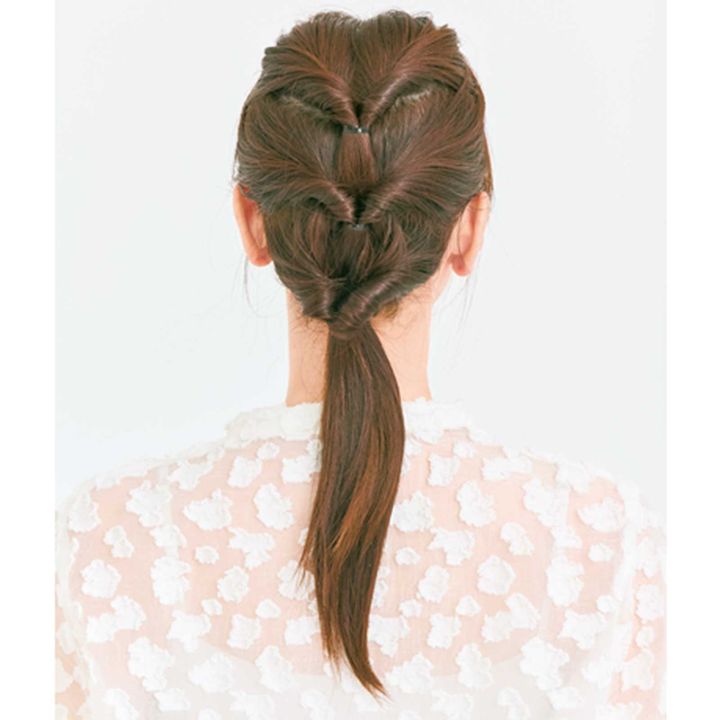 くるりんぱの位置は、低めで少し左右にずらすので、分け目や穴ができず、スカスカ感を解消。衿元の髪の一部は結ばずダウンスタイルにすることで、毛束のボリュームをキープ!