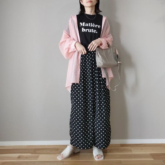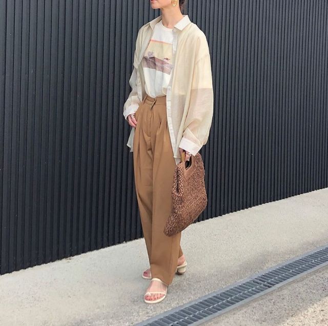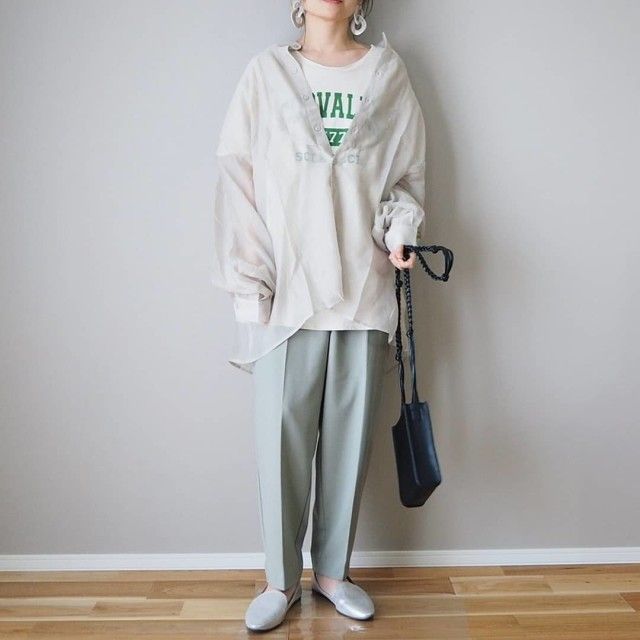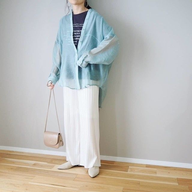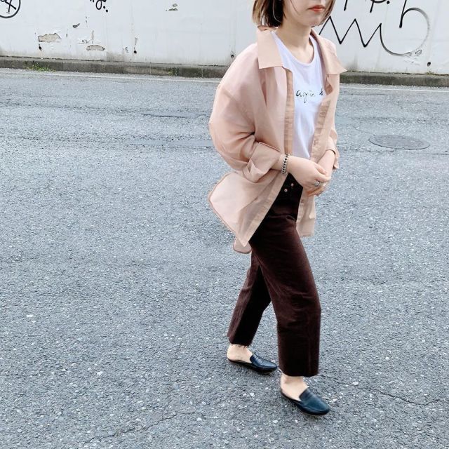 シアーシャツの派手見えが気になるときにも、この着こなし方はイチ押しです。カラーシアーシャツが落ち着いて普段使いしやすくなりますよ。