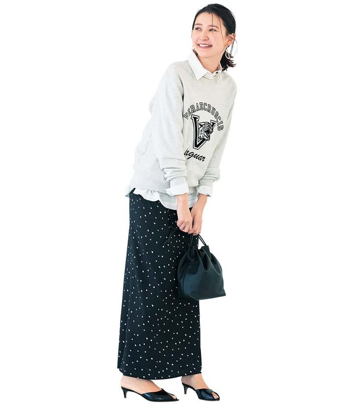 ミュール¥64,900(ペリーコ/アマン)スウェット¥20,900(ウィム ガゼット/ウィム ガゼット 玉川髙島屋S・C店)シャツ¥39,600(プレインピープル/プレインピープル青山)スカート¥19,800(カデュネ)バッグ¥45,100(ヴァジック/ヴァジックジャパン)ピアス¥47,300(ブランイリス/ブランイリス トーキョー)