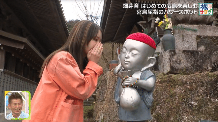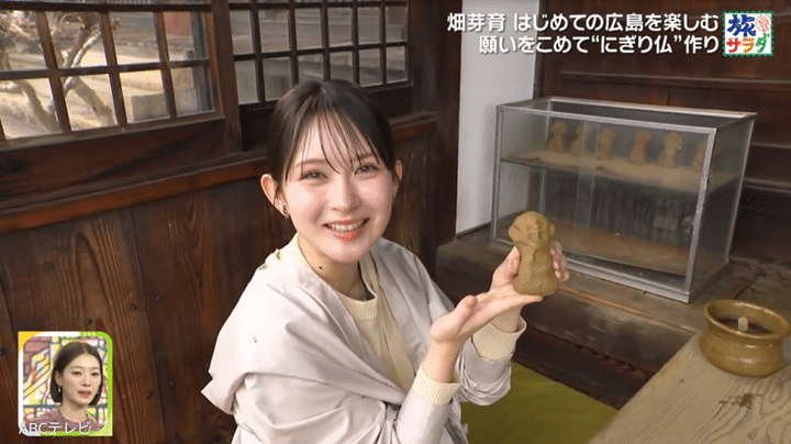 畑は、初めての『朝だ!生です旅サラダ』のロケで、これまた初めての広島県へ。尾道市では、持光寺名物の“にぎり仏”を作り、尾道ラーメンをモグモグ。宿泊先は福⼭市で、旬の鯛をふんだんに使った料理を味わった。また、念願だった宮島の嚴島神社を参拝でき、⼤聖院のパワースポットで願い事をし、名店のお好み焼きで旅を締めた。