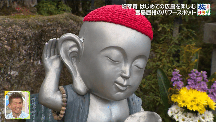 宮島最古の寺院・⼤聖院には、地蔵が500体以上もいる。その中で畑は、大きな耳でどんな愚痴でも聞いてくれる“愚痴聞き地蔵”が気になった。
