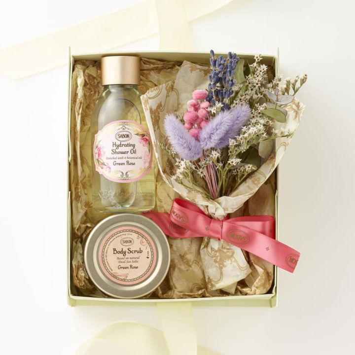 シャワーオイルやボディスクラブとともに、見た目にも華やかなギフトボックスが用意されており、開けた瞬間に心が華やぐような一品!アレンジメントフラワーキット(ハイドレイティング シャワーオイル 300mL、ボディスクラブ 60g、フラワーブーケ、ギフトボックス)全2種 ¥6,930 ※4月16日予約開始(公式オンラインストアのみ)/公式オンラインストア・楽天・LINEギフト限定 (SABON)