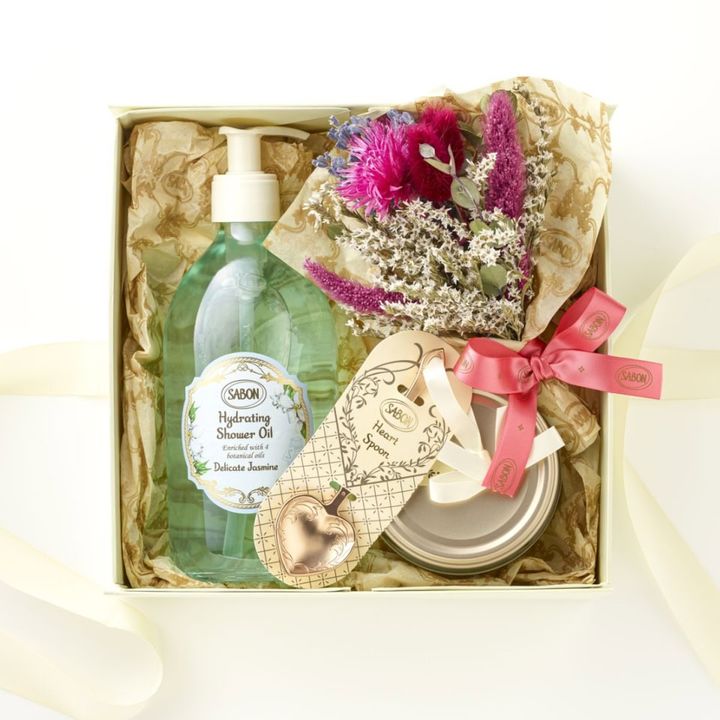 母の日にぴったりのフラワーブーケがセットになった「アレンジメントフラワーキット」は、特別感のある贈り物を探している方におすすめ。アレンジメントフラワーキット スペシャル デリケート ジャスミン(ハイドレイティング シャワーオイル 500mL、ボディスクラブ 320g、フラワーブーケ、ハートスプーン、ギフトボックス)¥11,000 ※4月16日予約開始/公式オンラインストア限定(SABON)