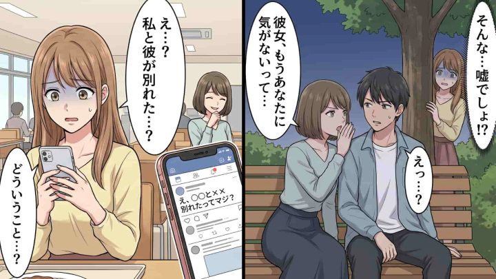 読者の実体験をもとにした衝撃エピソードをご紹介!同じサークルの彼氏と順調に交際していた私。しかしある日、身に覚えのない「別れた」という噂が広まってしまいます。その裏には、思いもよらない人物の影がありました――。