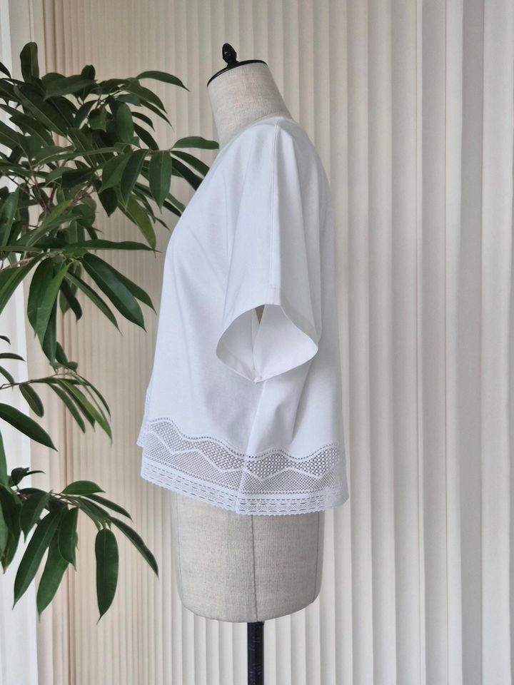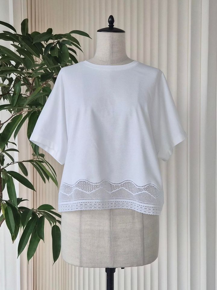 「コンパクトなクロップド丈を、大人の女性が楽しめるように考え尽くされたデザインTシャツです。裾に繊細なレースが施され、まるでブラウスのように華やか。ボディーはしっかりとハイゲージで編まれたスムース素材のTシャツなので、肌触りもよくストレスフリーな着心地です」(エディターSEIMU)