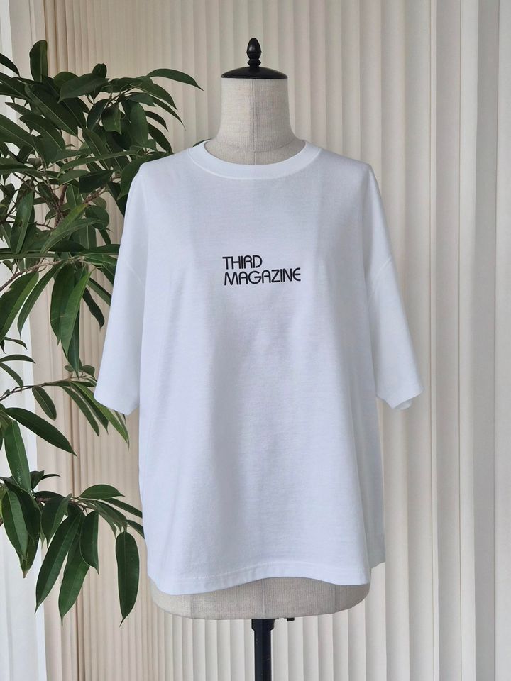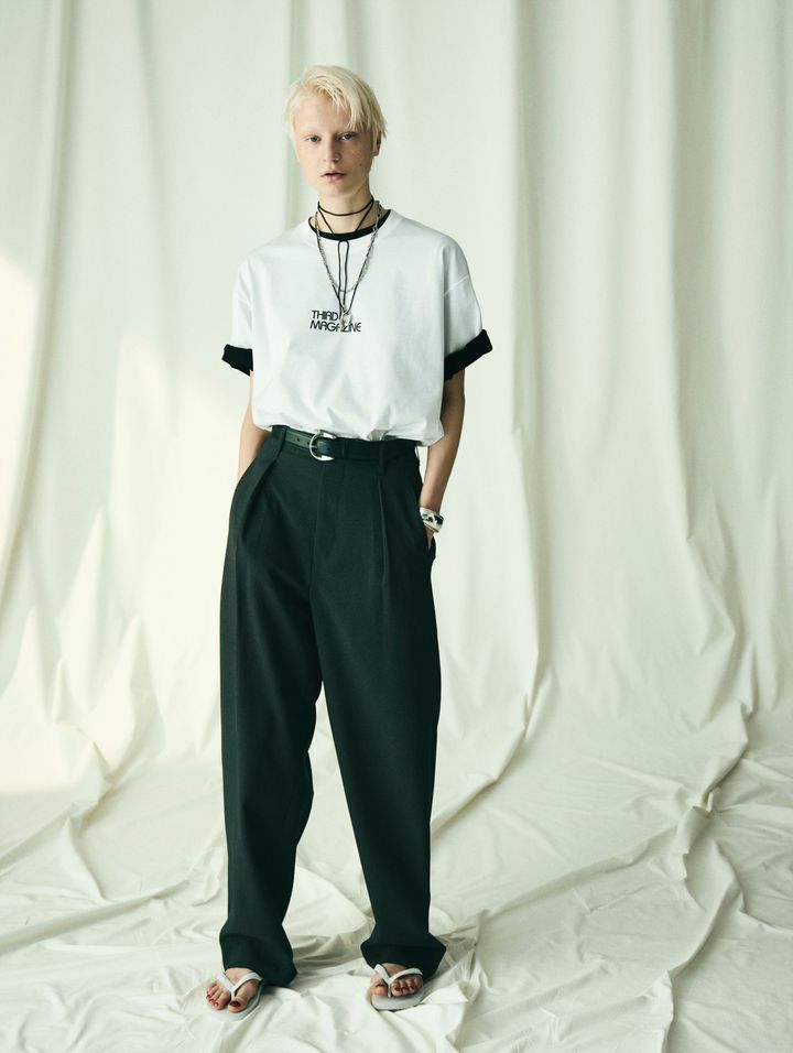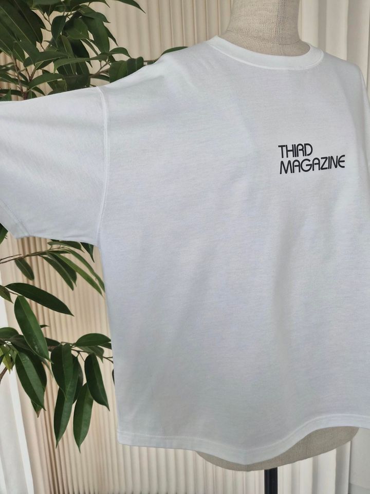 「丸みのある“THIRD MAGAZINE”のロゴプリントがワンポイントになった、ミニマルな白T。生成(きなり)やオフホワイトのようなニュアンスカラーではなく、本当に真っ白なTシャツなので、キリッとコーデ全体を引き締めてくれるような洗練ムードが漂っています」(エディターRISA)