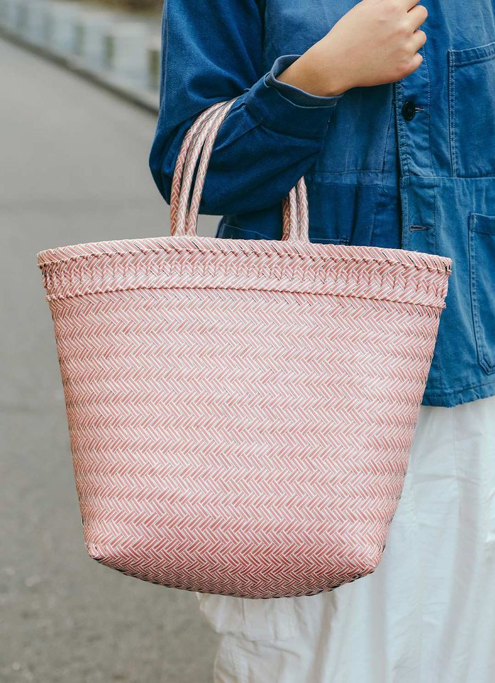 編み込みバッグがコーデの春ムードを格上げ! あたたかみのあるピンクが、フェミニンな華やぎを演出。