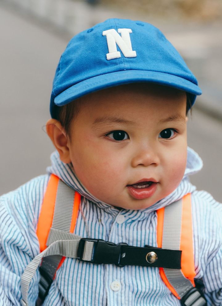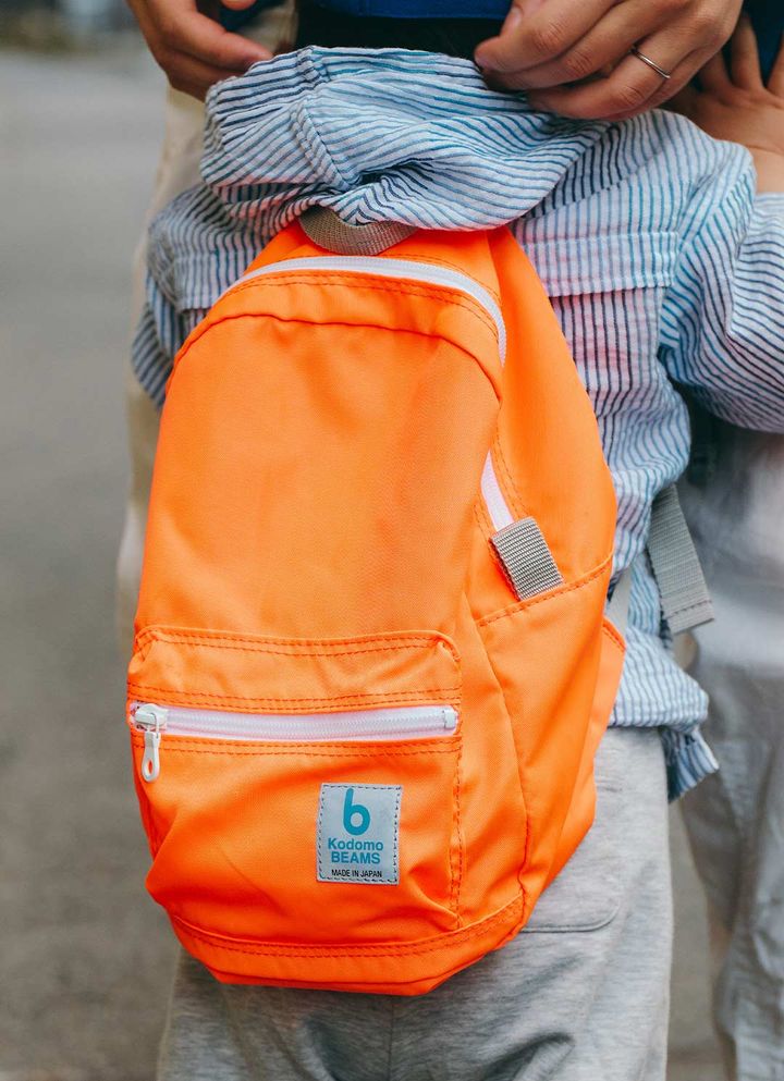 『こどもビームス』のオレンジリュックが、家族コーデの挿し色役に抜擢! 軽やかな素材に、アイキャッチになるカラーが魅力の名品。