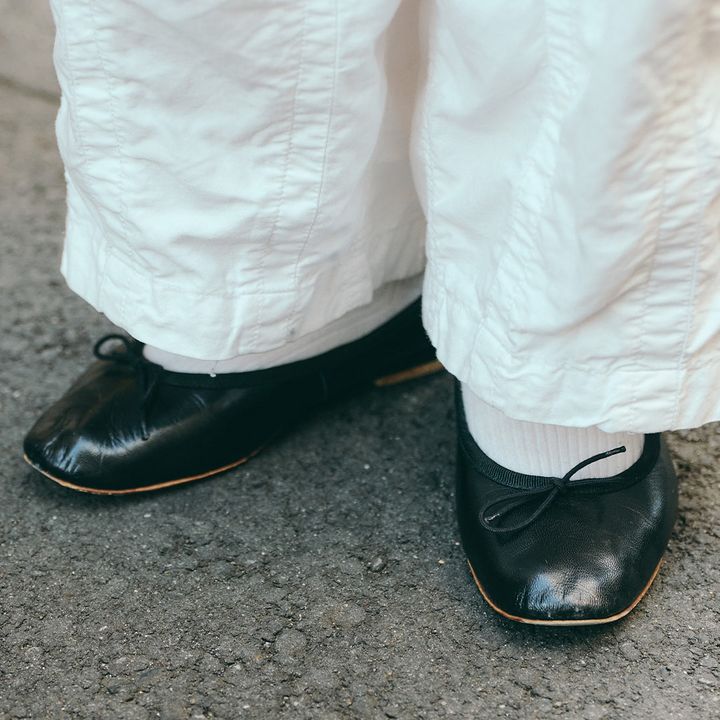 カーゴパンツから覗くのバレエシューズをキャッチ! メンズライクなコーデに女性らしさをひとさじ。