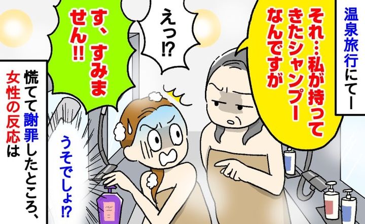 家族旅行の夜、子どもたちが寝静まったあとに大浴場でひとり時間を満喫していたときのこと。洗い場で頭を洗っていると、隣にやってきた女性から突然「それ、私が持ってきたものなんですが」と告げられ、頭が真っ白に! 慌てて謝った私に返ってきたのは、思いもよらぬ反応だったのです……。