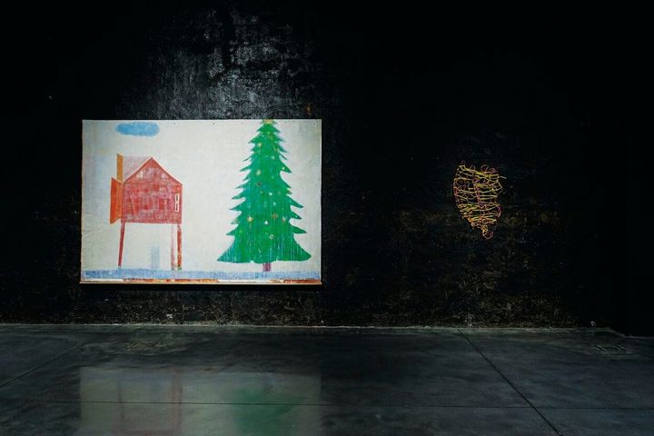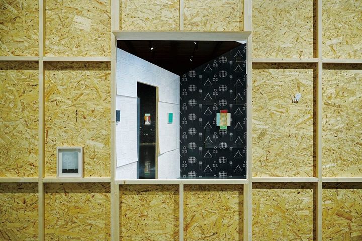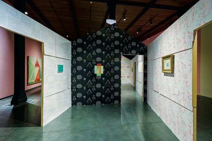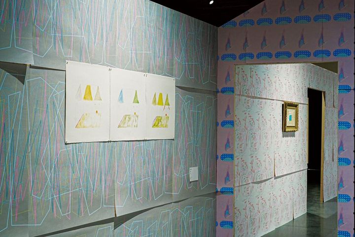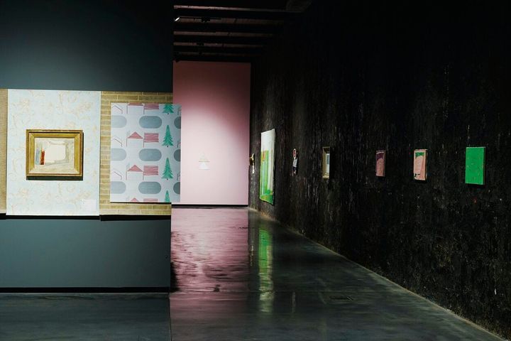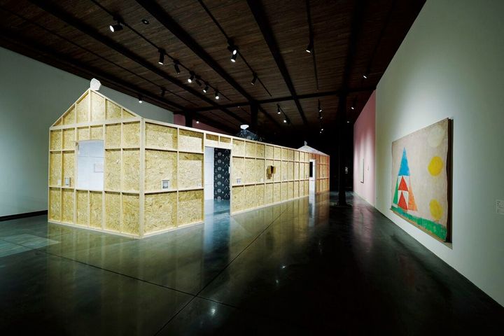 入り口すぐのスペースに広がる“建て込み”のような《えりとへりの小屋》(2025)は、杉戸洋と服部一成の共作。右手前の壁にかかる絵画は、1995年に杉戸が制作し、2024年に自身で手を加えてアップデートした《無題》。歩いて回ると、小屋の壁に開けられたガラスのない窓や、ドアのない入り口/出口から、表情の異なるさまざまな風景が覗く。 PHOTO: RYO NARITA, COURTESY OF HIROSAKI MUSEUM OF CONTEMPORARY ART. © HIROSHI SUGITO, KAZUNARI HATTORI