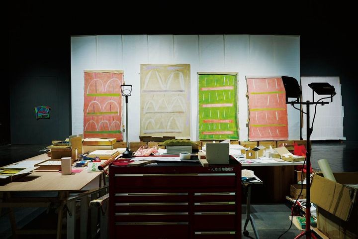 「作品がどのような空間から生まれてきたのか、この展示でつぶさに見てもらえます。実際に杉戸さんは展覧会の追い込みではこのスタジオ空間でずっと作業されてて、ギリギリまで新しい作品を生み出しました。それが壁にかかっています。コラボレーターの服部さんもここで一緒に作業していたので、服部さんの要素も入っています」
