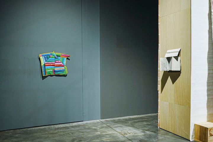 左の作品はゴクラ・シュトフェルのテキスタイルを用いた作品、《シェルター(避難場所)》(2025)。 PHOTO: RYO NARITA, COURTESY OF HIROSAKI MUSEUM OF CONTEMPORARY ART © HIROSHI SUGITO, KAZUNARI HATTORI, GOKULA STOFFEL
