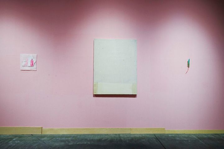 杉戸洋の《無題》(1993/2024、左)の隣に、ゴクラ・シュトフェルの油彩と磁器粘土を用いた《ウィービング・レター》(2025、右)がかけられ、作品同士がまるで会話を交わしているかのよう。 PHOTO: RYO NARITA, COURTESY OF HIROSAKI MUSEUM OF CONTEMPORARY ART © HIROSHI SUGITO, KAZUNARI HATTORI, GOKULA STOFFEL