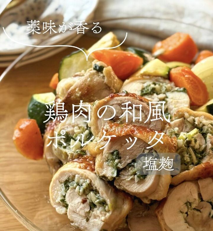 今回の「鶏肉の和風ポルケッタ」、塩麹の力でふっくらジューシー、薬味の力でさっぱりと。