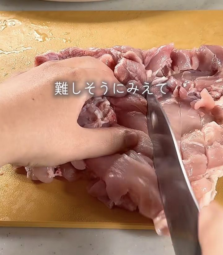 まずは鶏もも肉を広げ、厚い部分に包丁で切り込みを入れながら、できるだけ平たく広げていきます。