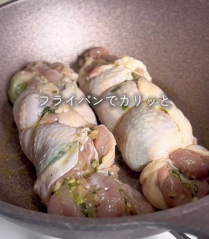 フライパンに油を熱し、皮目から中火でじっくり焼いていきます。がりと美味しそうな焼き色がつくまで、カリッと仕上げるのがコツ。