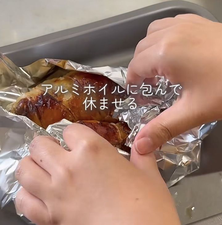取り出したお肉をアルミホイルで包み、15分ほど休ませます。