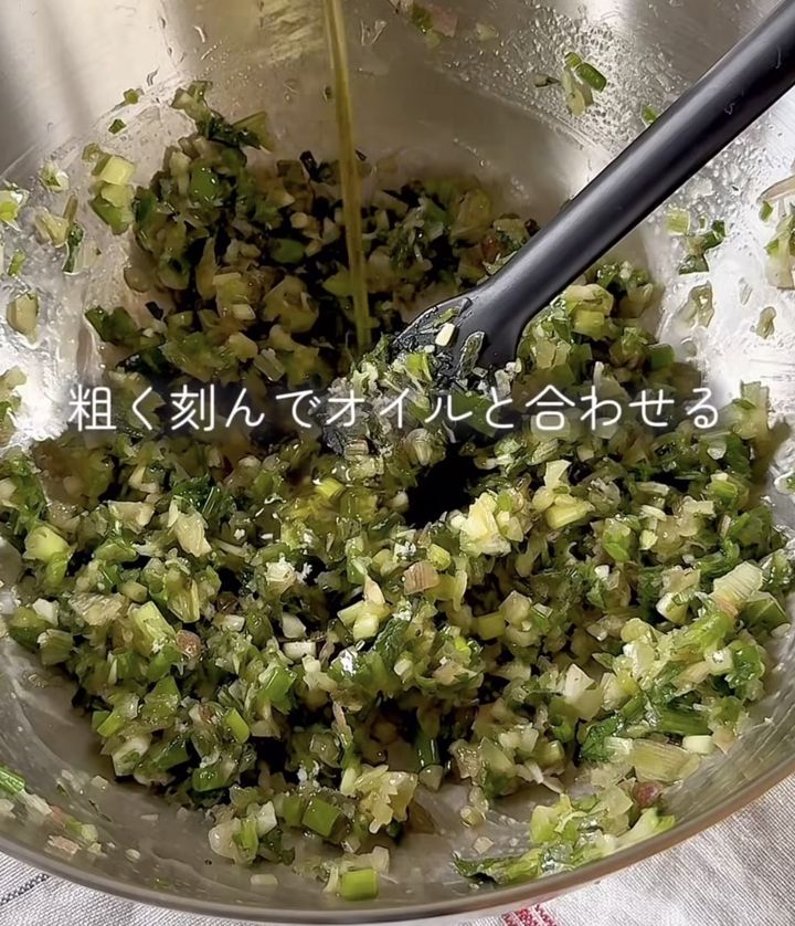 みょうが、小ねぎ、にんにく、大葉を粗みじん切りにして、オリーブオイルと塩ひとつまみを加えて混ぜ合わせます。