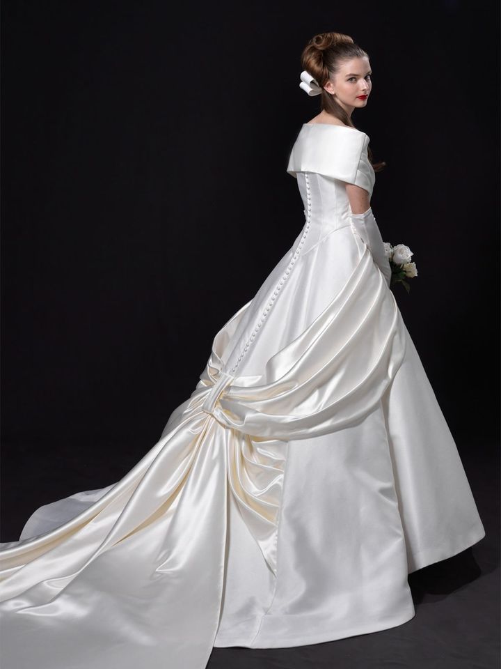 ロイヤル・ウエディングを彷彿とさせる、バッスルトレーンが印象的なドレス。バージン・ロードを歩く、教会やチャペルでのセレモニーにおすすめです。ドレス¥935,000(エマリーエ/エマリーエ ウエディングドレスサロン tel.03-6804-3090)