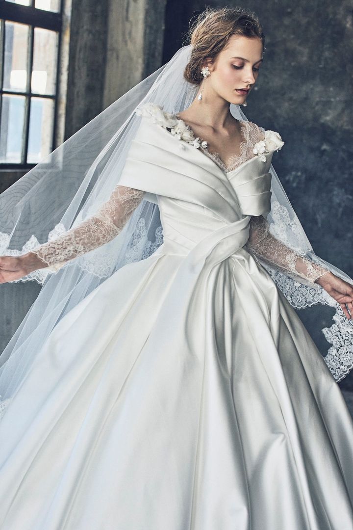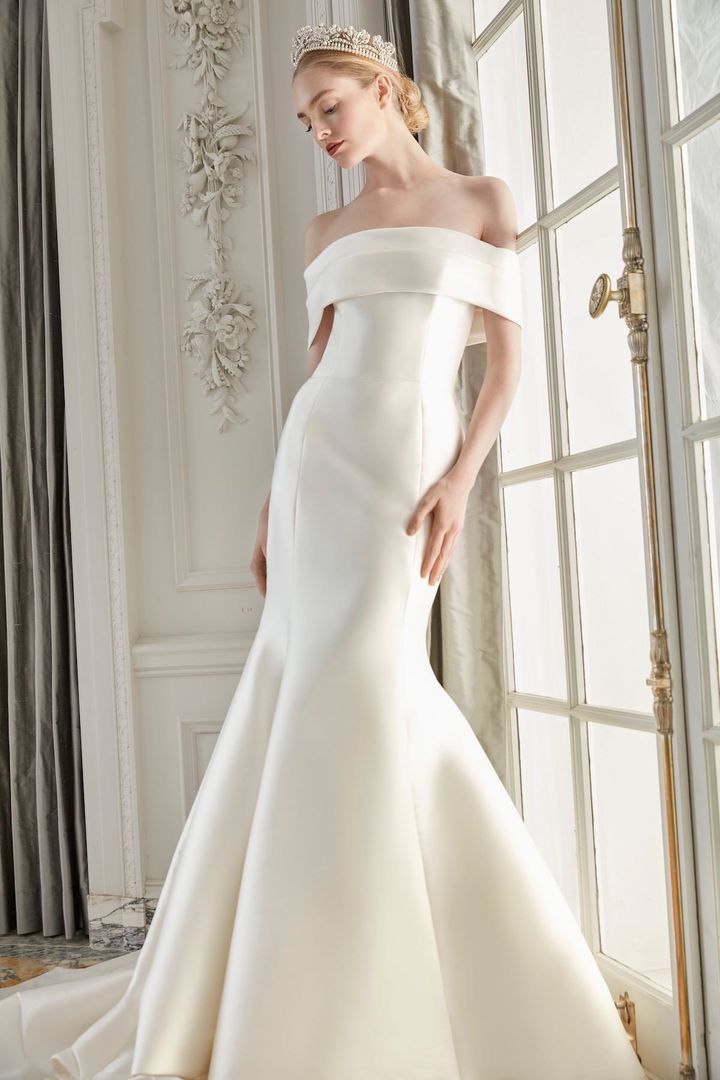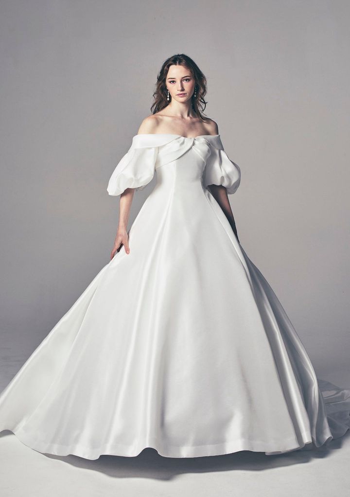 おしゃれ花嫁から支持されるニューヨークのブランド、サラ・ノーリ。美しいミカド素材だけを使用したオフショルダースタイルのマーメイドドレスは、コーディネート次第でさまざまな雰囲気を演出できます。ドレス¥429,000[レンタル価格](サラ・ノーリ/ミーチェ tel.03-5475-5120 )