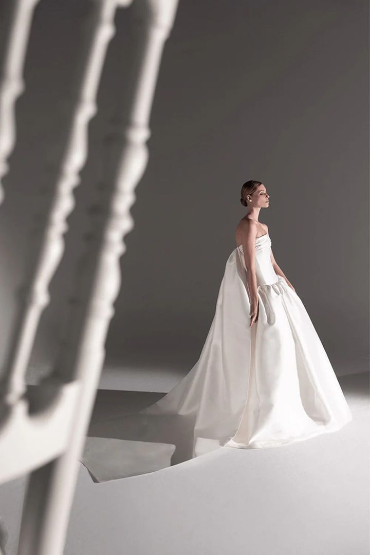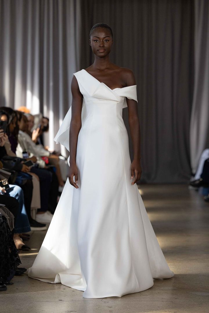 イタリアブランドのピーター・ラングナーは、モダンなデザインのドレスも多数発表。アシンメトリーなデコルテのデザインは、シンプルな素材づかいだからこそ美しいバランスに。ドレス¥451,000[レンタル価格](ピーター・ラングナー/ミーチェ tel.03-5475-5120 )