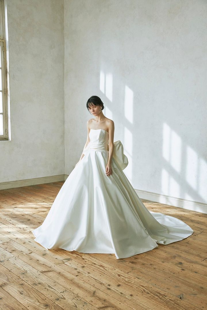 アントニオ・リーヴァ ミラノは構築的なデザインが人気のブランド。ハリのある素材を使用したものが多く、こちらはハツコ エンドウ ウェディングスの限定デザインです。ドレス¥660,000[レンタル価格](アントニオ・リーヴァ ミラノ/ハツコ エンドウ ウェディングス銀座 tel.03-3563-1411)