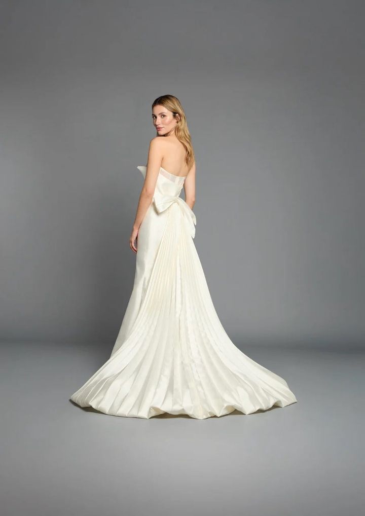 アントニオ・リーヴァ ミラノは、光沢のある素材を巧みにデザインしたものを多くリリースしています。アコーディオンプリーツのトレーンが特徴的なドレスは上品でありながら個性的なスタイルに。ドレス¥649,000[レンタル価格](アントニオ・リーヴァ ミラノ/ミラー ミラー 表参道 tel.03-6427-1811)
