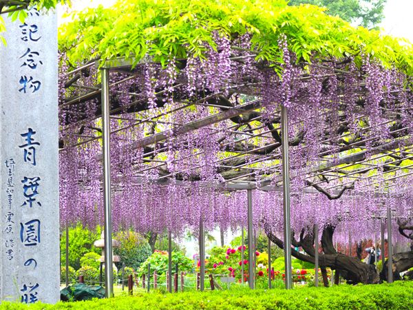 昭和27年に開園した緑豊かな公園墓地。県の天然記念物に指定される「青葉園のフジ」は、樹齢700年超の名木で、幹回り2m以上の3本が、東西10 ~ 12m、南北11 ~ 13mにも広がり棚いっぱいに枝を伸ばします。花穂は1mを超え、満開時には圧巻の華やかさ。4/ 24(金)・25(土)は、夜間ライトアップイベントも実施(詳細はHPで)。フジの後は、ツツジ、アジサイ、ヒマワリと、季節の花々が園内を次々と彩ります。