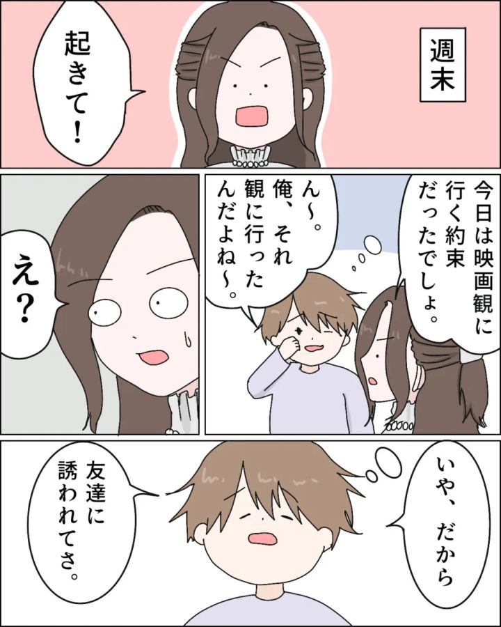 今日はレイと映画を観に行く約束をしていた日。朝早く起きて身支度を整え、まだ眠っているレイを起こすと「俺、それ観に行ったんだよね~」という思いがけない言葉を言われて、思わず固まってしまいました。話を聞くと、以前友達に誘われてすでにその映画を観てしまったと言うのです。