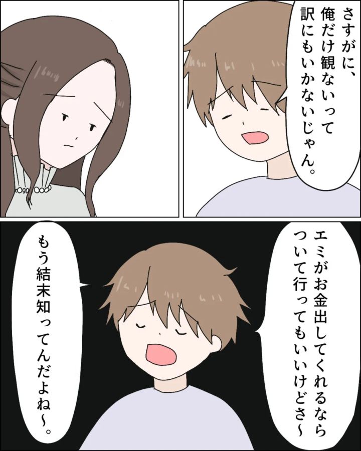 ずっと前から約束していたのに、レイは映画を先に観てしまったことを謝りもしませんでした。それどころか「さすがに俺だけ観ないって訳にもいかないじゃん」と、自分は悪くないと言わんばかりの言い訳。挙げ句の果てには、「エミがお金出してくれるならついて行ってもいいけどさ~もう結末知ってんだよね~」と上から目線で言ってきました。