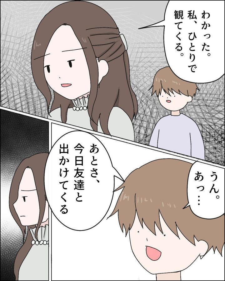私はレイに背を向けると「わかった、私ひとりで観てくる」と言いました。するとレイは、謝ることも申し訳なさそうにすることもなく、「うん、あっ・・・あとさ、今日友達と出かけてくる」と平然と言いました。