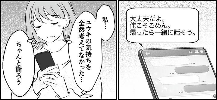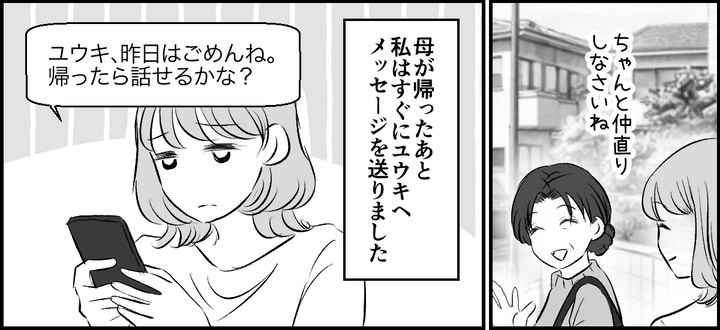 「ユウキくんはエナがつらい思いをしないようにって、一生懸命考えてくれているの。今回のことだって謝ってくれているんだし、悪気があったわけじゃない。うっかりしてしまっただけ」母にそう言われて……私はユウキにひどい態度をとってしまったことを反省しました。母が帰ったあと、私はすぐにユウキへLINEを送りました。