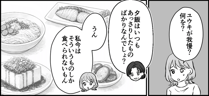 そういえばユウキは、毎日つわりの私向けのあっさりした食事を用意してくれるうえに、文句ひとつ言わず一緒に食べてくれています……。