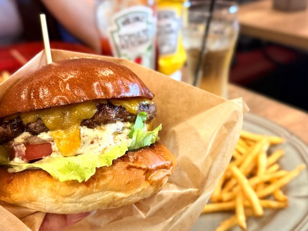 店内にふわっと広がるのは、お肉が焼けるあの食欲をそそる香り。この時点でもう期待値がぐっと上がります。豊富なメニューはどれも美味しそうで迷いましたが、私は初めてなので王道のチーズバーガー、娘はベーコンチーズバーガーをチョイス。