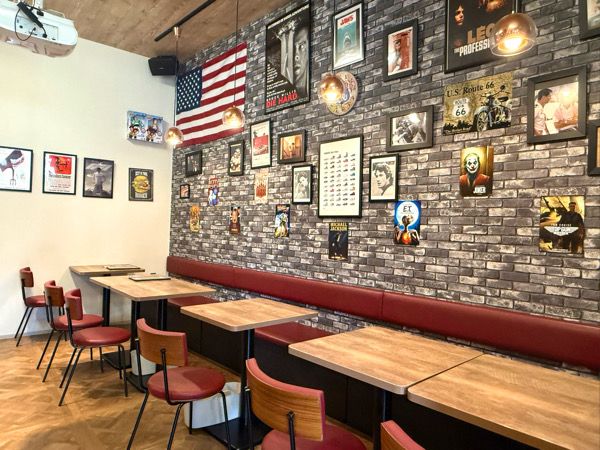 店内はアメリカンな雰囲気で、カップルやファミリーでにぎやか。テラス席ではワンちゃん連れの姿も見られ、幅広いシーンで楽しめそうです。