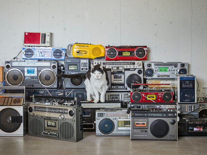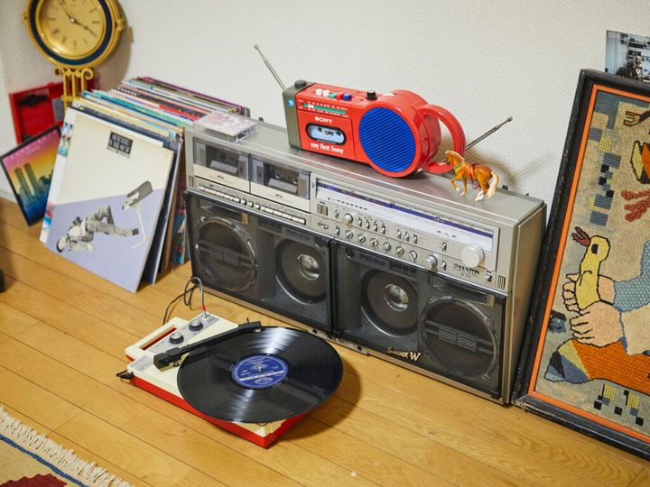 そのラジカセは、〈シャープ〉の「GF-999」という機種で、横幅が75センチくらいあるバカでかいやつです。カセットテープはゴムベルトが劣化していて聴けなかったのですが、外部入力にコードを挿してiPodを繋げ、撮影現場に持ち込んで音楽を鳴らしていました。どっしりとした動かないオーディオセットも良いですが、場所を選ばずに持ち運べるラジカセもカッコいい。2台、3台と増え始め、テープが聴ける状態の良い機種とも出合えました。当時、カセットテープはレコード屋の隅で安く眠っていたので、片っ端から買い集めていました。ラジカセはさらに増え続け、気づけば20台以上に。怖いですねえ。