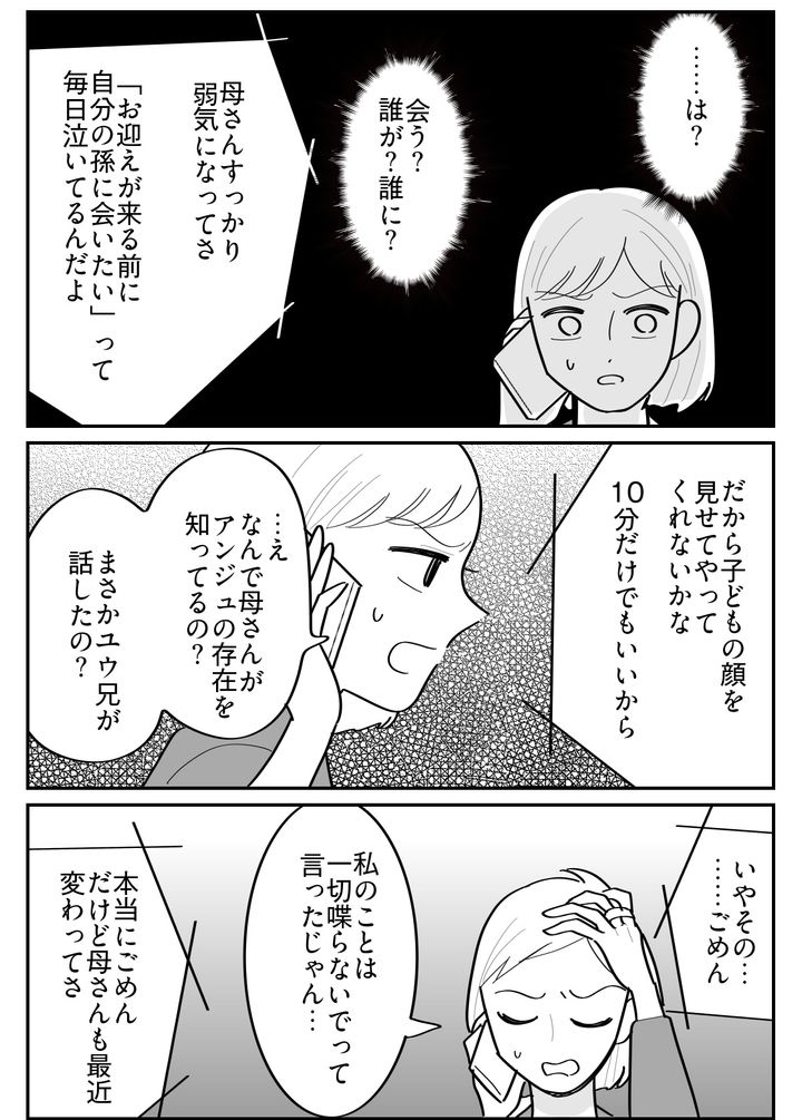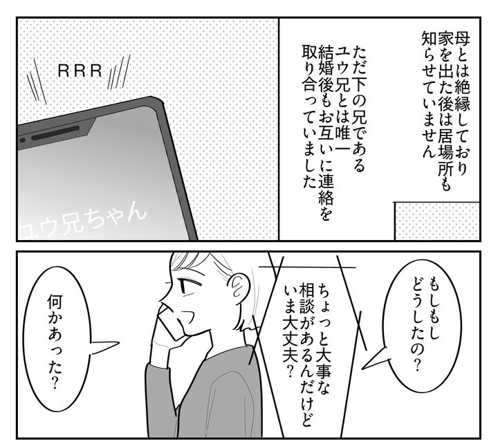 私はホナミ(30代)。私の母は若くして離婚し、シングルで私たち3人きょうだいを育てていました。母は上の兄のキイチばかり溺愛し、下の兄のユウジは空気みたいな扱い。そして末っ子である私には暴言を浴びせ、真冬にベランダに閉め出すなどさんざん虐げていました。高校卒業と同時に逃げるように家を出た私は、夫のサトルと出会いました。やがて娘のアンジュ(2歳)も生まれ、現在の幸せな暮らしを手に入れたのです。そんなある日、ユウ兄から電話が……?